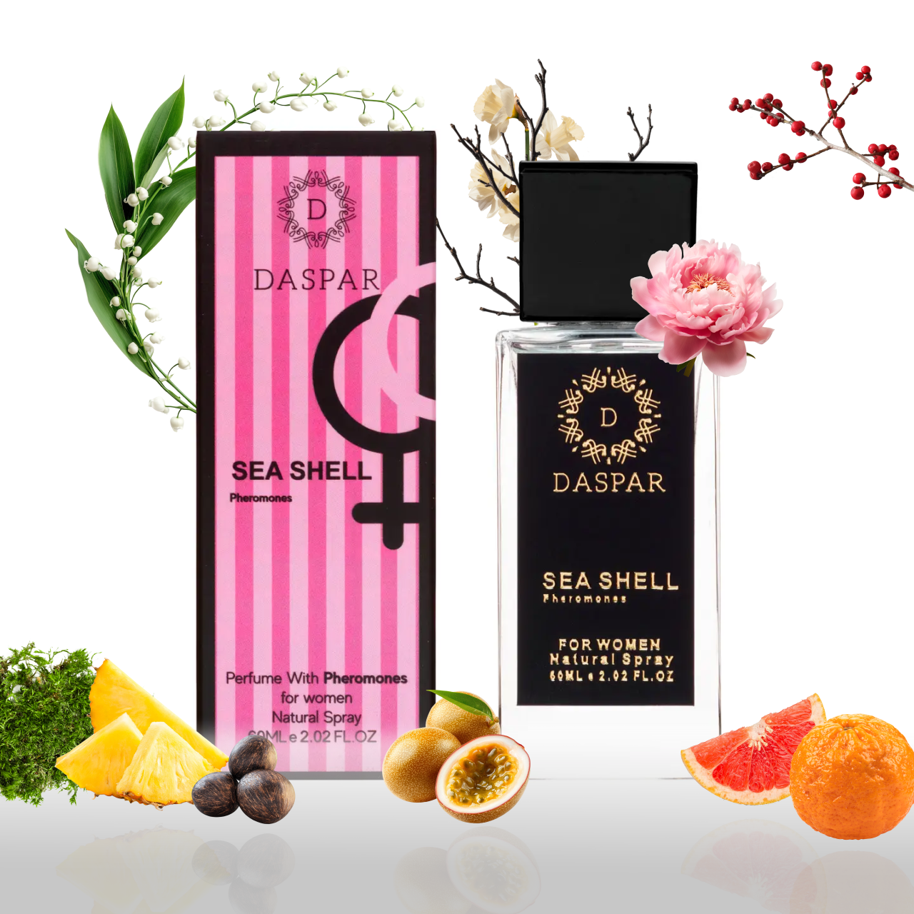 Sea Shell with Pheromones — Your Secret to Holding Attention on You. Dominated by the elegant vanilla orchid, which envelops with its creamy sweetness, intertwined with sensual honey-sweet jasmine emitting temptation. Delicate, bell-like lily of the valley adds cleanliness and freshness, while luxurious velvety peony embodies elegance and romance. And, of course, sweet, succulent red berries add playfulness and refinement, reminiscent of summer evenings and passionate kisses.
